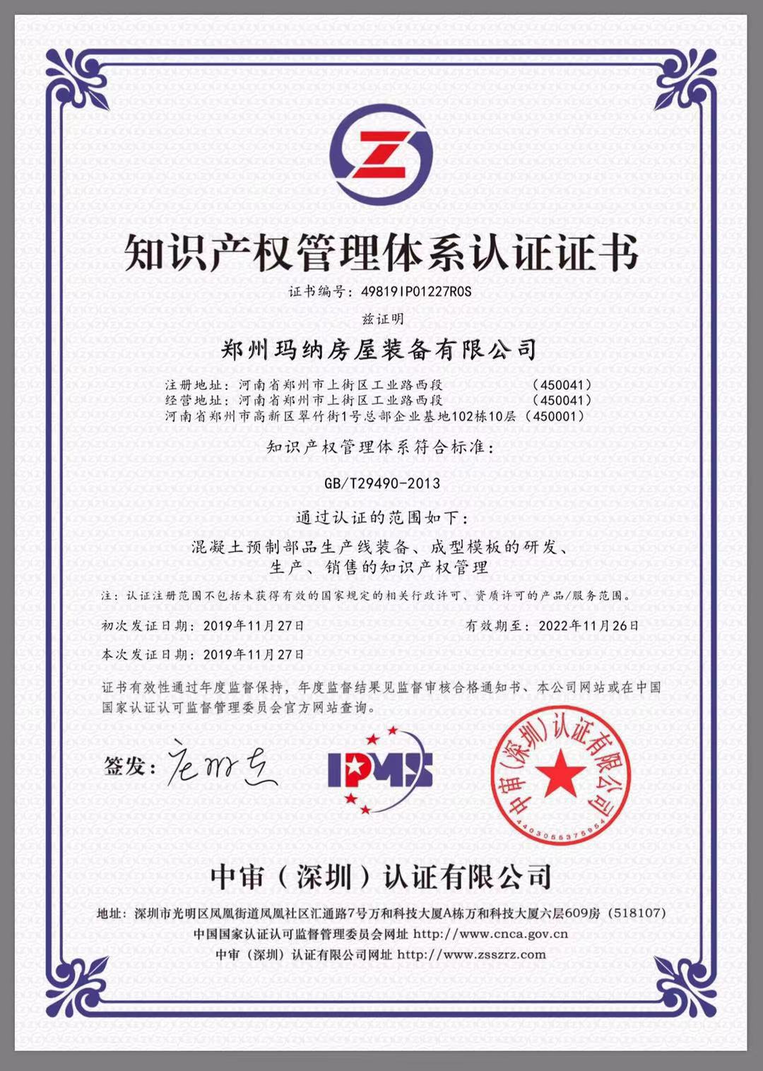 2019年11月27日,鄭州瑪納房屋裝備有限公司獲得第三方認證機構頒發的《知識產權管理體系認證證書》,