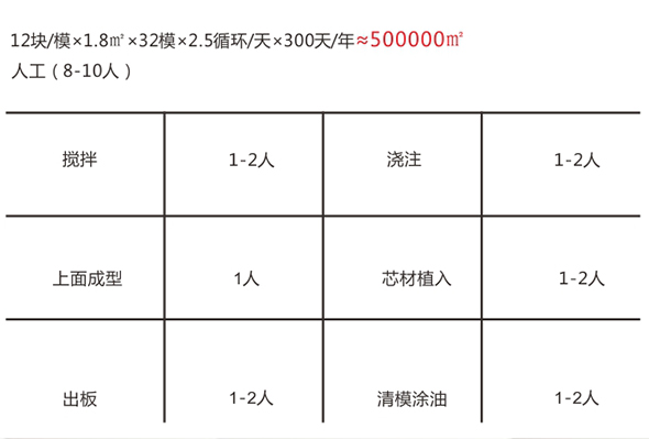 M08復合墻板生產(chǎn)線主要設(shè)備組成有:集約式低能耗養(yǎng)護室、第三代成組立模、立模回轉(zhuǎn)機、上抹面成型機、第三代液壓抽芯機、壓力注料系統(tǒng)、合板翻板機構(gòu)、推板機構(gòu),標準生產(chǎn)線產(chǎn)能年產(chǎn)達50萬㎡(2440mmX610mm)。