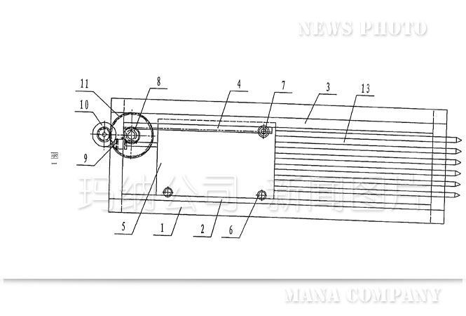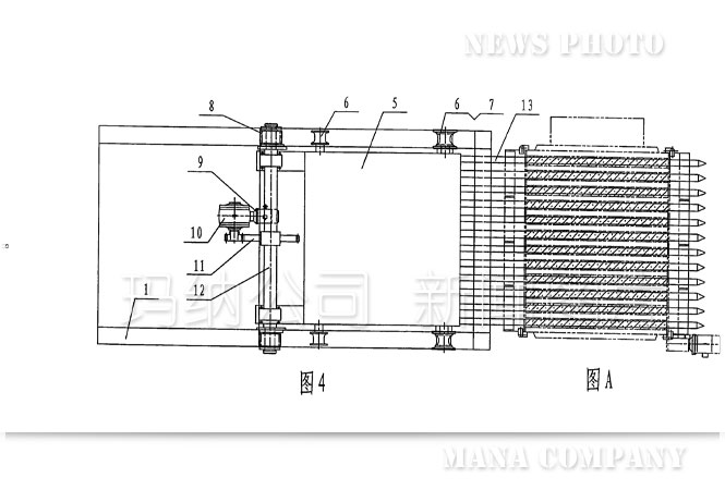 傳統(tǒng)的抽芯機(jī)結(jié)構(gòu)(如圖1——圖4):機(jī)架1上設(shè)置有下導(dǎo)軌2和上導(dǎo)軌3,在上導(dǎo)軌3的后半部分固定有齒條4,行走小車5上安裝的下滑輪6、上滑輪7、小齒輪8分別與下導(dǎo)軌2、上導(dǎo)軌3、齒條4接觸并能沿之前后移動,進(jìn)而帶動行走小車5前端連接的芯管13一起向前或向后移動,即完成多孔墻板在成型過程中穿、拔芯管的功能。上述運(yùn)動是由電機(jī)9、減速機(jī)10、大齒輪11、傳動軸12等組成的驅(qū)動系統(tǒng)帶動行走小車5上的小齒輪8與齒條4相嚙合來實(shí)現(xiàn)的。從上述結(jié)構(gòu)可以看到傳統(tǒng)的抽芯機(jī)動力傳動部分是機(jī)械傳動:電機(jī)9轉(zhuǎn)動——減速機(jī)10調(diào)速、換向——大齒輪11轉(zhuǎn)動——傳動軸12轉(zhuǎn)動——小齒輪8轉(zhuǎn)動與齒條4嚙合——行走小車5和芯管13前后平移,運(yùn)動轉(zhuǎn)換次數(shù)多、傳動結(jié)構(gòu)復(fù)雜、傳動零件種類多,從設(shè)計、制作、使用、檢修都比較麻煩,而且對芯管位移量的定位也不太精確。